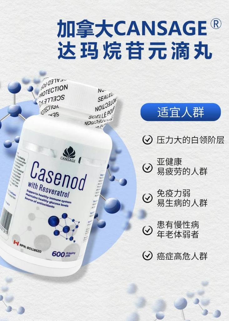 CANSAGE达玛烷苷元+白藜芦醇滴丸全球独创,采用世界独创的 PPD 制备技术和滴丸配方,高效吸收,无副作用, 在同等剂量下是其他皂苷产品(粉剂、片剂、胶囊)的 50 倍以上。